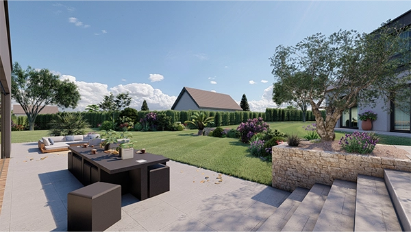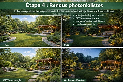 Enfin, nous générons des images 3D haute définition qui montrent votre jardin comme il sera réellement. Vous pouvez voir :