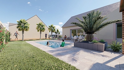- Éléments visualisables : terrasse, clôture, plantations, allées, éclairage, bassins